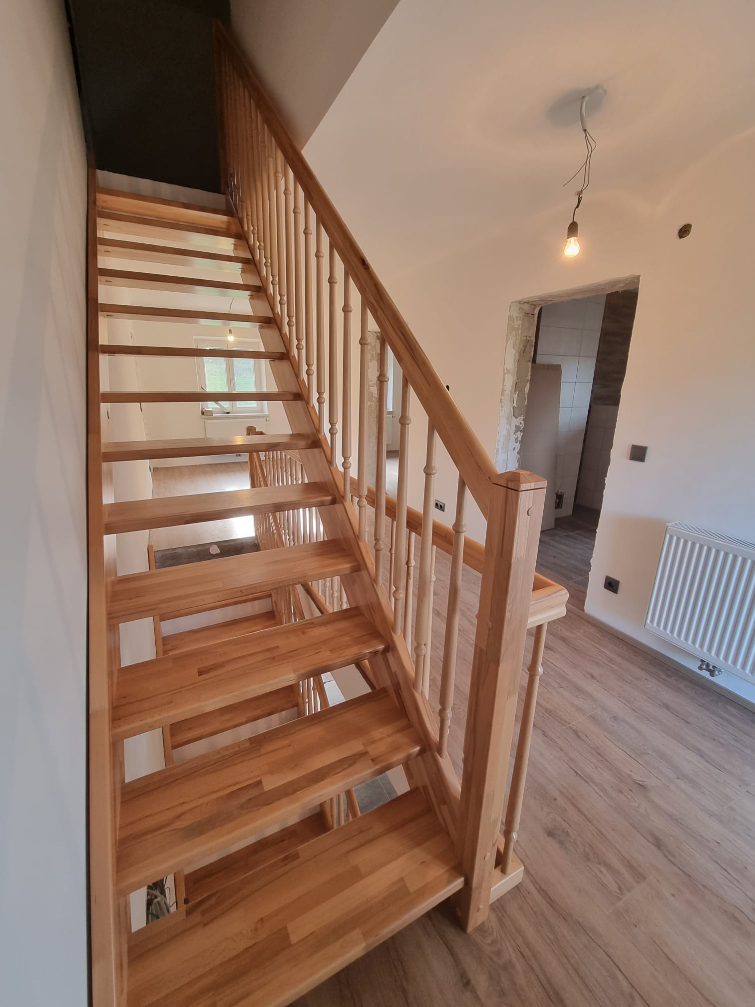 Die aufgesattelte Holzwangentreppe besticht durch ihre offene und stabile Konstruktion. Diese traditionelle Treppenart fügt sich harmonisch in verschiedene Wohnstile ein und lässt sich individuell anpassen – eine perfekte Kombination aus klassischem Handwerk und zeitlosem Design.